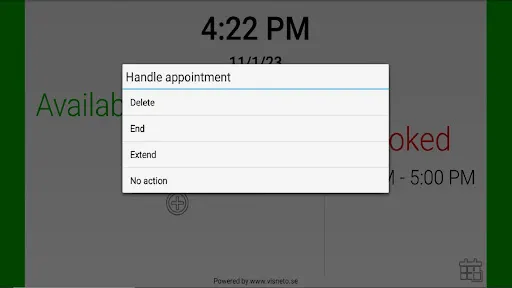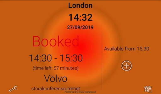 Through simple settings you have the option to customize and personalize your Visneto to make it even more exclusive and time saving. The Visneto display shod be wall-mounted and can be placed vertically or horizontally. When active, the display can show the name of the room and status, including time of the meeting and the actor who made the reservation. You can also see the date and the next meeting on the front page. It is also possible to request confirmation of the meeting "on site" (otherwise the meeting will be deleted). An ongoing meeting you can click and choose: End, Extend (15 minutes) or delete with just two taps on the screen.