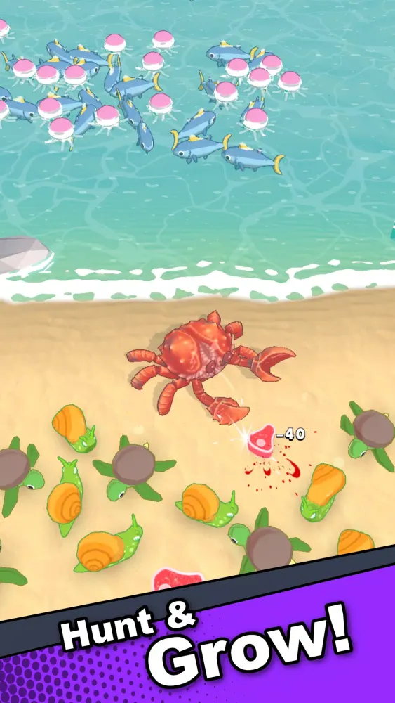 Engage in intense battles against humans and beach animals. Collect valuable resources like meat to enhance your crab's capabilities. Upgrade your crab's stats to become stronger and more formidable. Each victory brings you closer to conquering new territories and unlocking exciting new features.