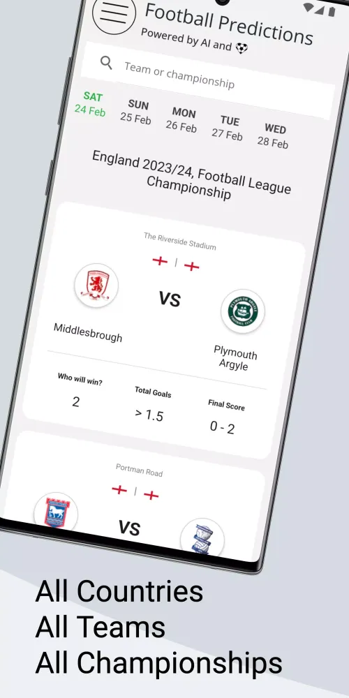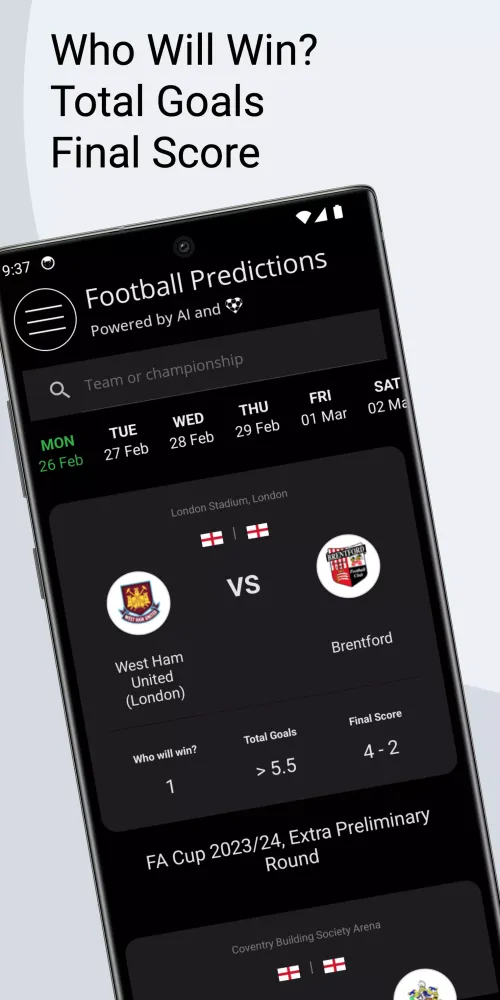 One of the standout features of the app is its ability to cater to your specific needs. You can browse predictions for today's matches, tomorrow's fixtures, or even select a particular day to view forecasts. Additionally, the app allows you to search for matches by team or league, making it easy to stay informed about your favorite clubs or competitions. For those interested in tracking past events, the app also provides results for completed matches, ensuring you never miss out on the excitement of previous games.