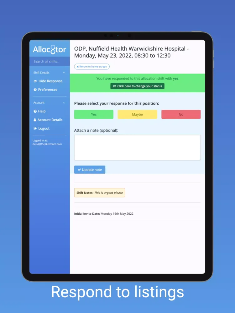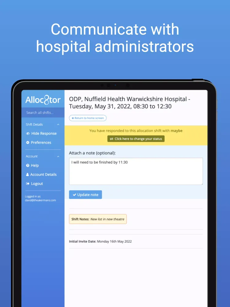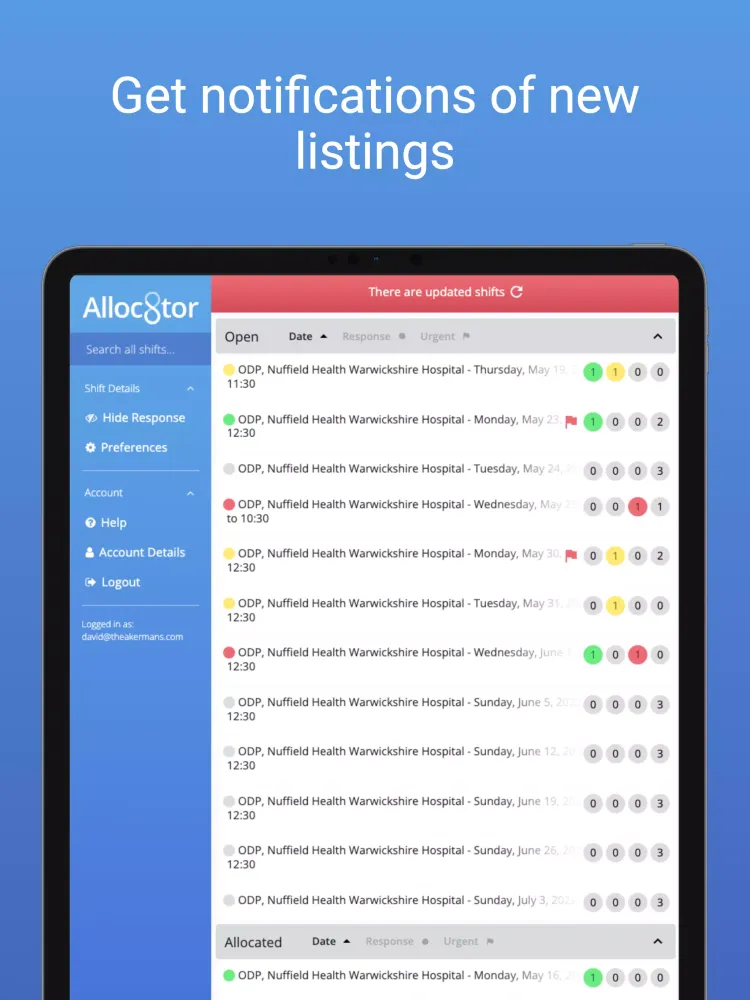 Communication is at the heart of Alloc8tor's functionality. Whether it’s through emails, SMS messages, or in-app notifications, all relevant parties stay informed about shift details and updates. Timely reminders are automatically sent to healthcare professionals to prevent missed opportunities. This attention to detail ensures that no shift goes unnoticed and that everyone involved remains engaged throughout the process.