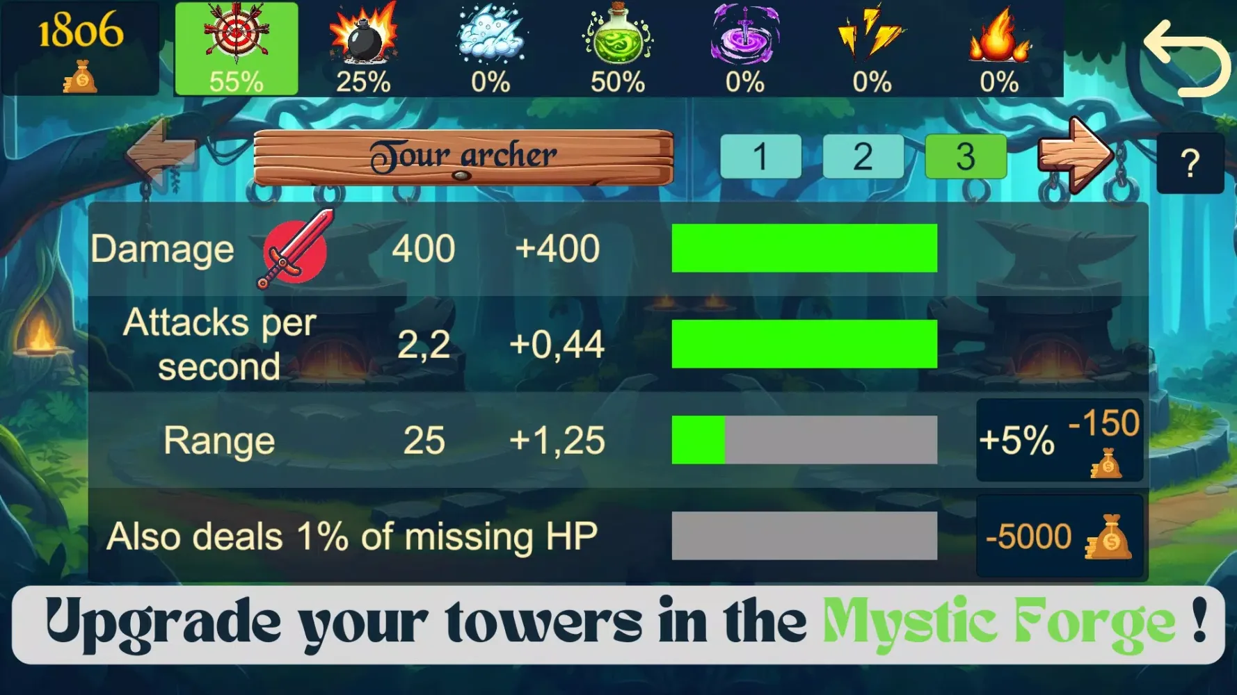 لتحسين قدراتك الدفاعية، تحتوي أرواح الغابة على ساحة سحر حيث يمكنك ترقية أبراجك. هذه الترقيات لا تزيد فقط من قوة أبراجك، بل أيضًا تقدم مهارات جديدة، مما يسمح لك بالتكيف مع السيناريوهات الأصعب. سواء كنت ترفع سرعة الهجوم، أو تزيد المدى، أو تضيف تأثيرات خاصة مثل الهجمات الإقليمية، فإن ساحة السحر تعطيك القدرة على تخصيص استراتيجيتك لتتناسب مع أسلوب لعبك.
