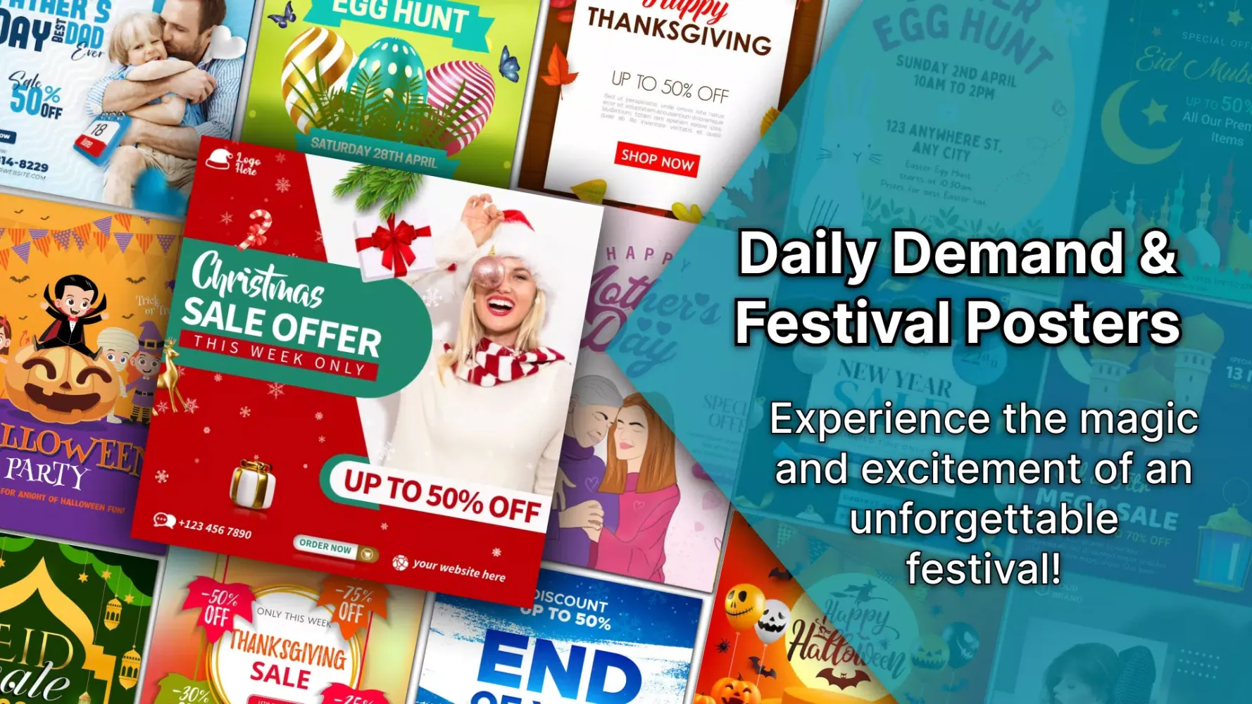 The Festival Poster Maker & Flyer Maker is a versatile tool that includes a wide array of templates for various events and festivals such as Christmas, Easter, Halloween, Thanksgiving, New Year, Black Friday, Eid, and Valentine’s Day. These templates are perfect for creating sale offers and party designs, ensuring your event stands out.