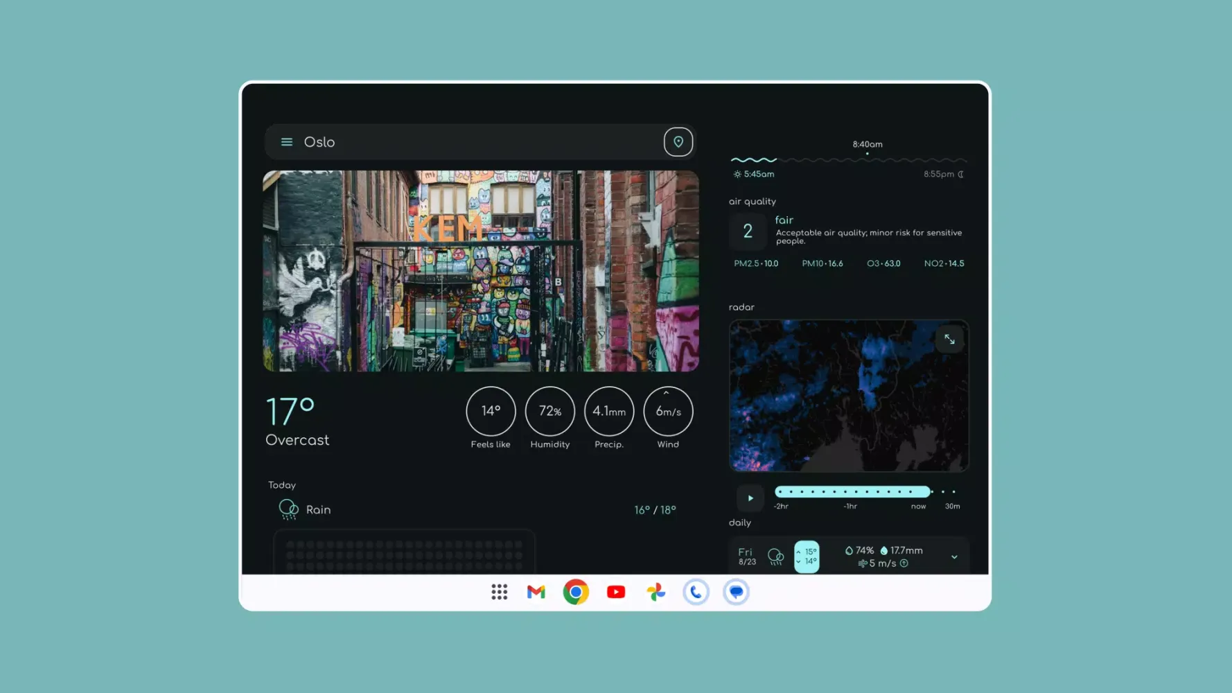 One of the standout features of Overmorrow Weather is its dynamic color scheme. The app automatically adjusts its colors based on the current weather conditions, creating a visually engaging experience. This attention to detail extends to other aspects of the app, such as the sunrise and sunset times, air quality insights, and detailed forecasts. For those who love customization, the app offers five distinct color themes, giving users the ability to tailor their experience to their preferences.