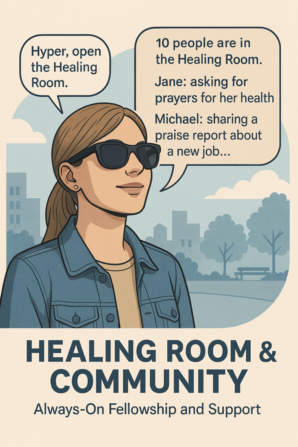 To wind down the day, Sarah decides to drop into the Blessed App’s community Healing Room. This is a live audio chatroom where people share prayers and encouragement – a virtual support fellowship. Instead of staring at her phone, she simply says, “Hyper, join the Healing Room.” Instantly, she hears the gentle voices of the community through her glasses. One member is sharing a testimony of healing; another is asking for prayer. As names and comments scroll by on others’ screens, Sarah’s AI assistant softly speaks their words to her, almost like an audiobook of a chat. Inspired, Sarah decides to contribute. “Hyper, record a message: I’m praying for you all, and I believe God is with us tonight,” she speaks. The assistant transcribes and posts her encouragement into the chat. Even though she’s tidying up the kitchen, Sarah is fully present in that spiritual discussion – no hands, no phone, just heart. When a closing prayer begins, she bows her head, still wearing the glasses, and prays along. By 10 PM, when she finally takes the glasses off, she realizes that technology has woven prayer, scripture, and community into every part of her day in a truly effortless way.