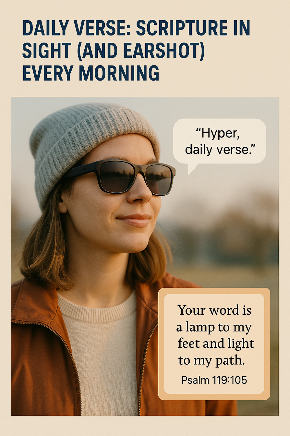 Many believers start their day with a daily Bible verse, and Blessed App’s home screen prominently features one each day to meditate on. Traditionally, you’d read it on your phone or get a notification. With AIoT-enabled sunglasses, that daily verse truly goes mobile in a whole new way. Imagine your morning routine: you step outside with your coffee, say “Hyper, daily verse,” and instantly hear the verse of the day along with a short reflection. This hands-free scripture delivery means you can absorb God’s Word while walking the dog, driving, or watching a sunrise – moments where pulling out a phone might not be convenient (or safe). The Blessed App’s content is optimized to be brief but impactful, perfect for an audio snippet.