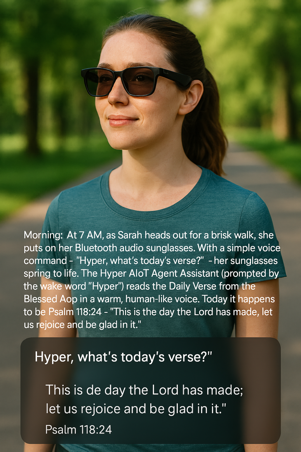 At 7 AM, as Sarah heads out for a brisk walk, she puts on her Bluetooth audio sunglasses. With a simple voice command – “Hyper, what’s today’s verse?” – her sunglasses spring to life. The Hyper AIoT Agent Assistant (prompted by the wake word "Hyper") reads the Daily Verse from the Blessed App in a warm, human-like voice. Today it happens to be Psalm 118:24“This is the day the Lord has made; let us rejoice and be glad in it.”
