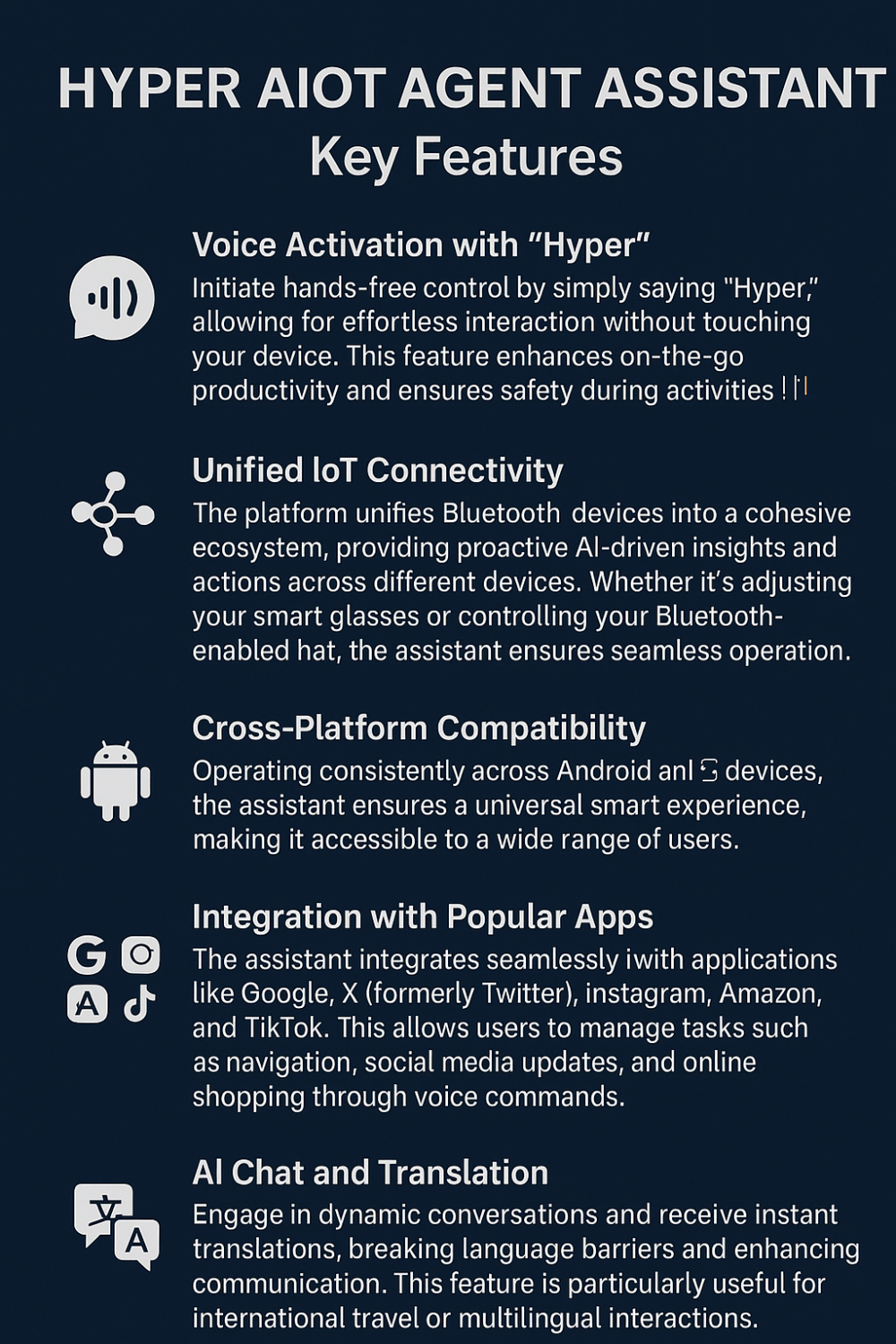 The Hyper AIoT Agent Assistant is a groundbreaking platform that merges Artificial Intelligence (AI) with the Internet of Things (IoT), transforming conventional Bluetooth-connected devices into intelligent, hands-free smart terminals. Compatible with both Android and iOS, it allows users to manage and control various IoT devices—such as headphones, speakers, smart glasses, and wearable gadgets—using voice commands.