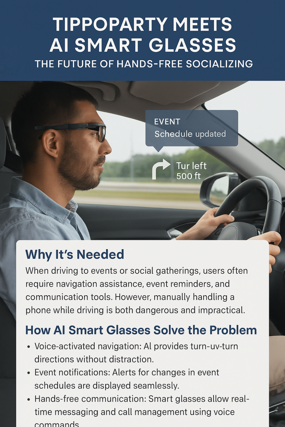 Mark, a busy event organizer, was juggling too many tasks. Between coordinating events via his smartphone and managing day-to-day communications, he found that traditional mobile interactions often distracted him during critical moments—whether behind the wheel or at the gym. That was until he discovered the power of TippoParty integrated with AI Smart Glasses.