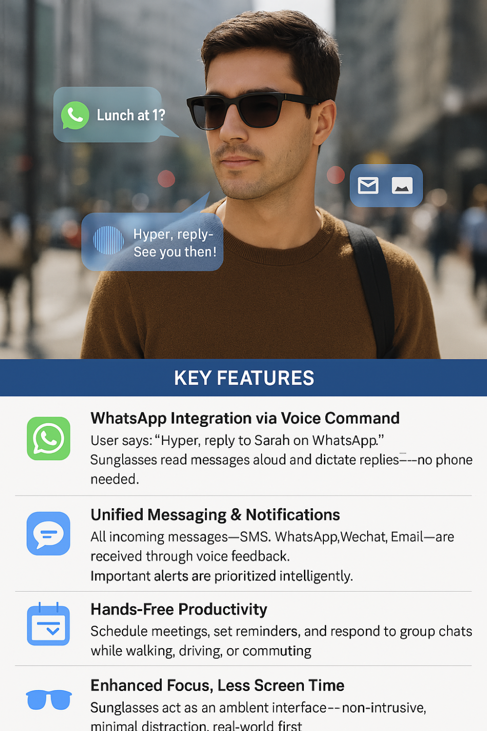 Mid-ride, Sam hears a gentle chime in his open-ear speakers – it’s a WhatsApp message from his boss, automatically read aloud over the wind noise. “Morning! Running late to the meeting, can you lead the kickoff?” Without missing a beat (or a pedal), Sam speaks a quick reply, “Sure, I’ve got it covered.” His sunglasses, through the AI assistant, capture his voice and send the message via WhatsApp, all while his hands remain firmly on the handlebars. A moment later, another ping: his team’s group chat is discussing design ideas. Sam asks, “Hyper, summarize the new messages,” and the assistant delivers a brief update, so he’s informed by the time he arrives at the office. What once might have required pulling out a phone at a red light is now a seamless, eyes-up experience – a glimpse into a futuristic efficiency that’s already at our doorstep.