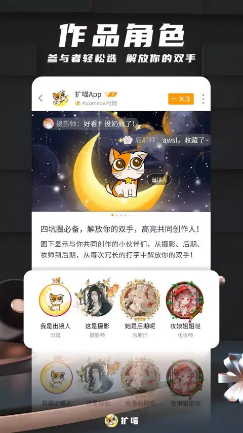 Photographers, editors, makeup artists, prop designers, and illustrators are just some of the professionals waiting to collaborate with you. By joining 扩喵, you become part of a supportive network where everyone shares a common goal: to celebrate and elevate anime culture together.