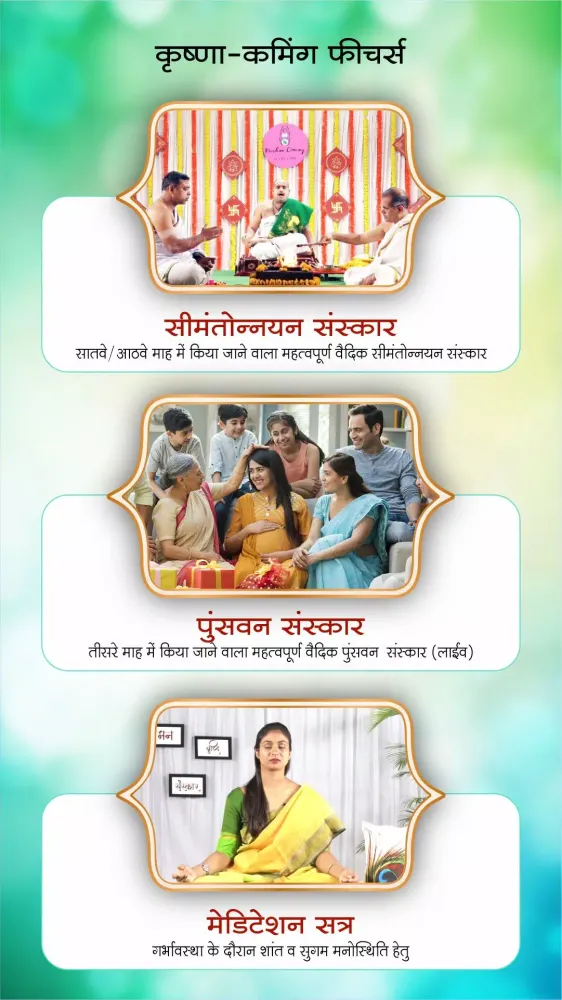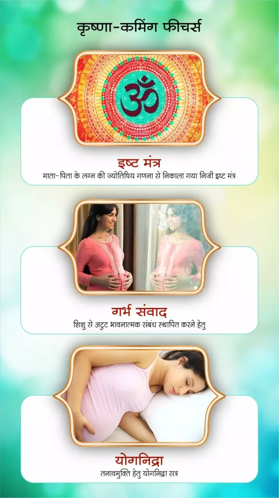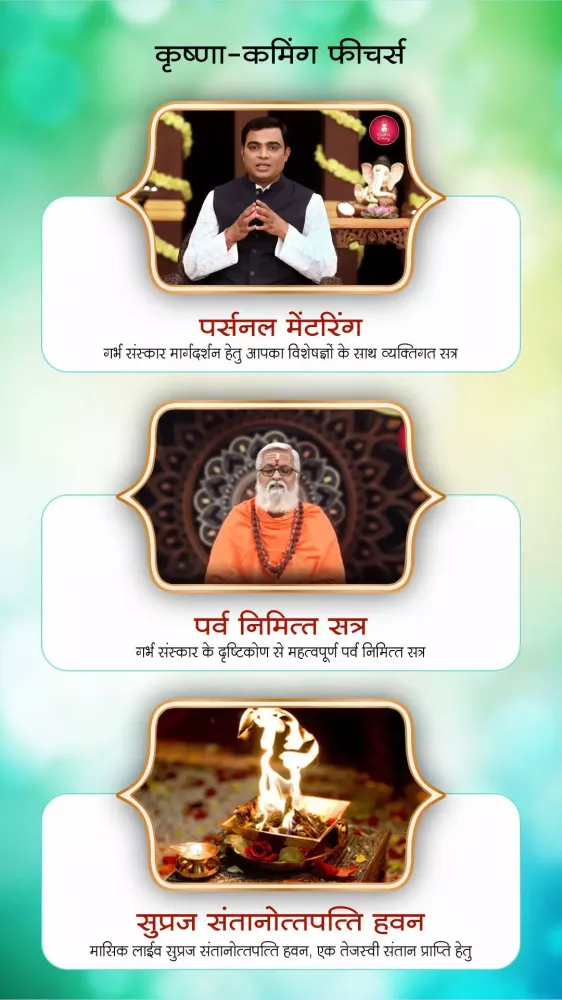 At the heart of "Garbh Sanskar: Krishna Coming" lies a comprehensive suite of features aimed at fostering a harmonious environment for both mother and child. The app offers live Garbh Sanskar Sankalp Poojan sessions, where mothers can perform sacred rituals to set intentions for their child's future. Additionally, the Garbh Sanskar Sutra Sessions delve into the principles of prenatal care, offering insights into how parents can positively influence their baby's development.
