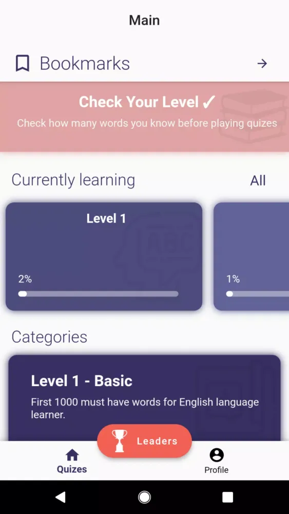Beyond the core quizzes, the app offers a "Check Your Level" quiz to assess your current vocabulary size. This tool helps you identify areas for improvement and tailor your study plan accordingly. Additional cool features include tracking your progress alongside peers, reviewing mistakes, and revisiting bookmarked words at any time. With its user-friendly interface and diverse range of activities, the Learn 5000 English Words Quiz app is perfect for anyone eager to enhance their English skills in a fun and rewarding manner. Join the community today and embark on an exciting path to language mastery!