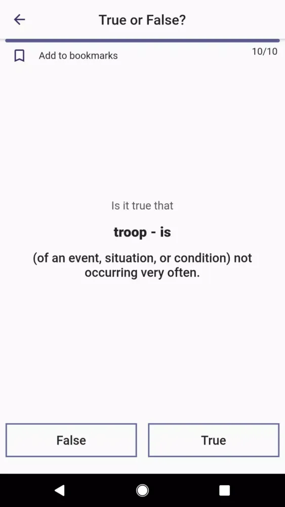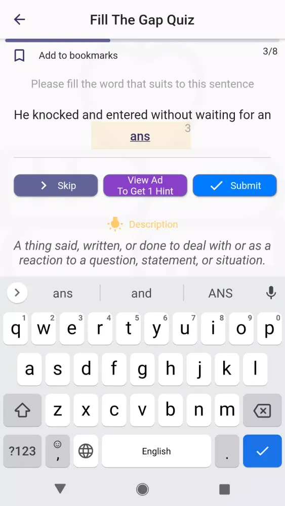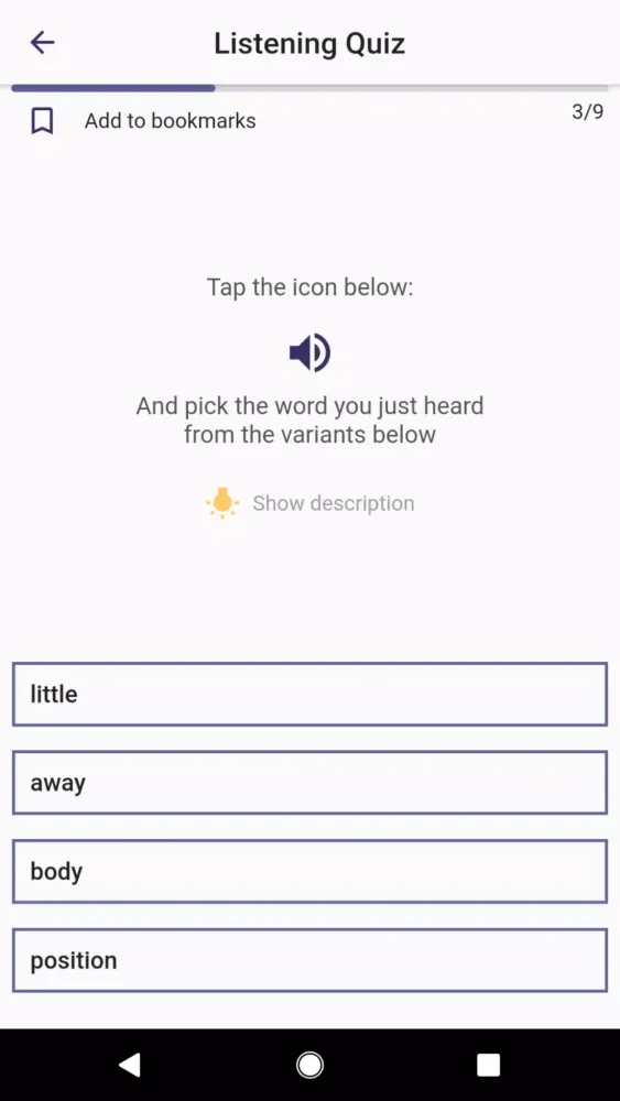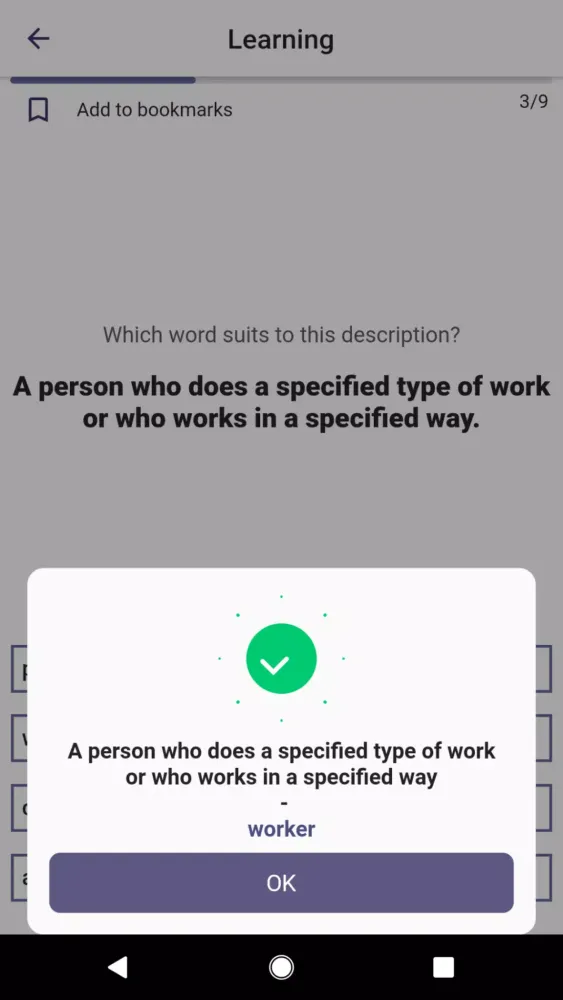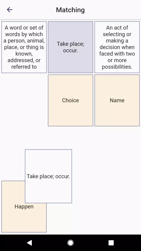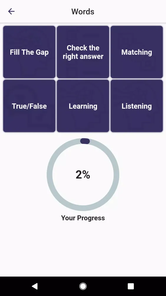 To make learning enjoyable and effective, the app offers six distinct types of quizzes. For instance, the "Fill The Gap" trivia challenges you to complete sentences by selecting the correct word, complete with hints and contextual examples. The "Check the Right Answer" quiz tests your ability to match descriptions with the correct words, while the "Matching" activity lets you drag and drop tiles to practice word-to-description associations. Other quizzes include "True/False," where you evaluate statements, and "Listening," which enhances your pronunciation and listening skills. Additionally, the "Learning" quiz combines elements from all previous formats to provide a well-rounded comprehension experience.