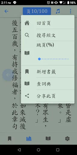 搜尋目錄、全文檢索、書籤功能、網址分享、離線瀏覽、語音播放、佛學詞典、佈景主題切換、經文分頁、字型調整、楷書字型、直式文字、app更新、跨平台、無廣告、開放原始碼。