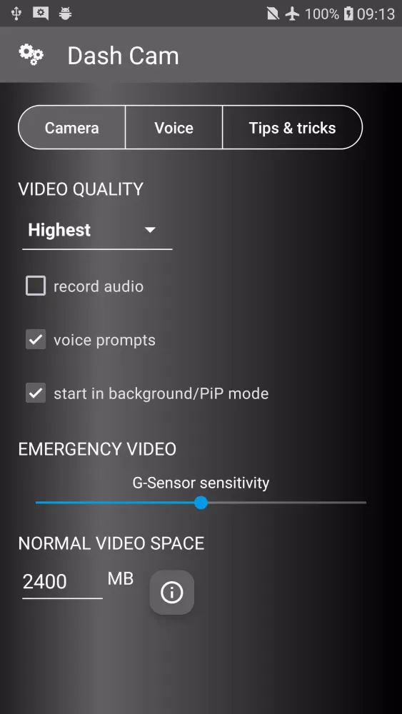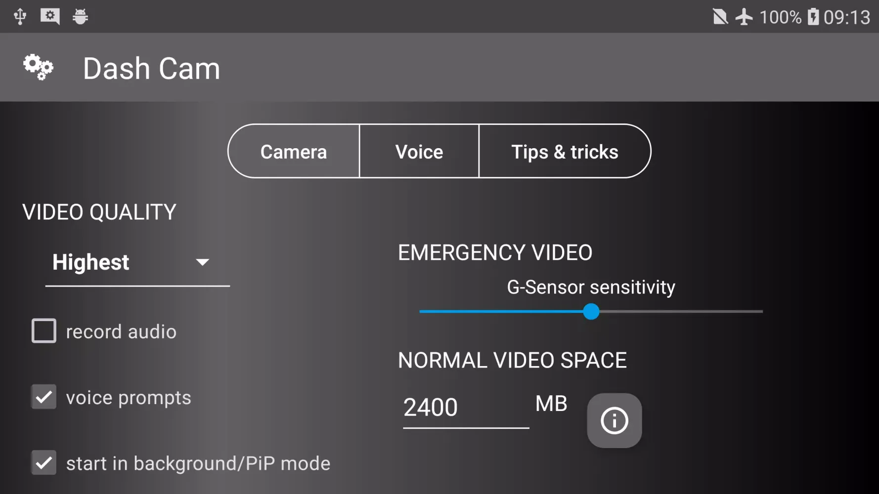You have complete control over your recording preferences. Easily configure the storage allocation for your videos and adjust the video quality settings. Whether you want to document your entire trip or capture specific significant events, this app has got you covered.