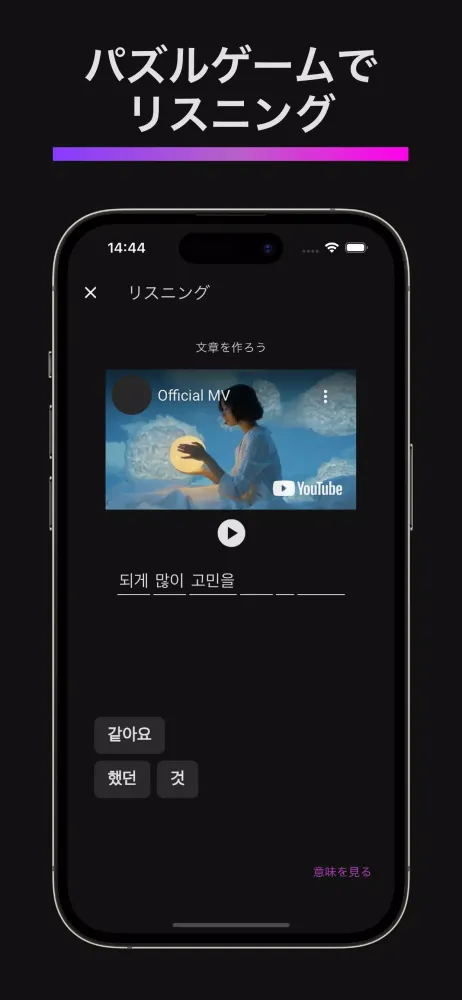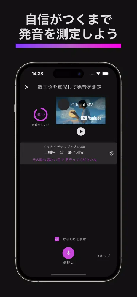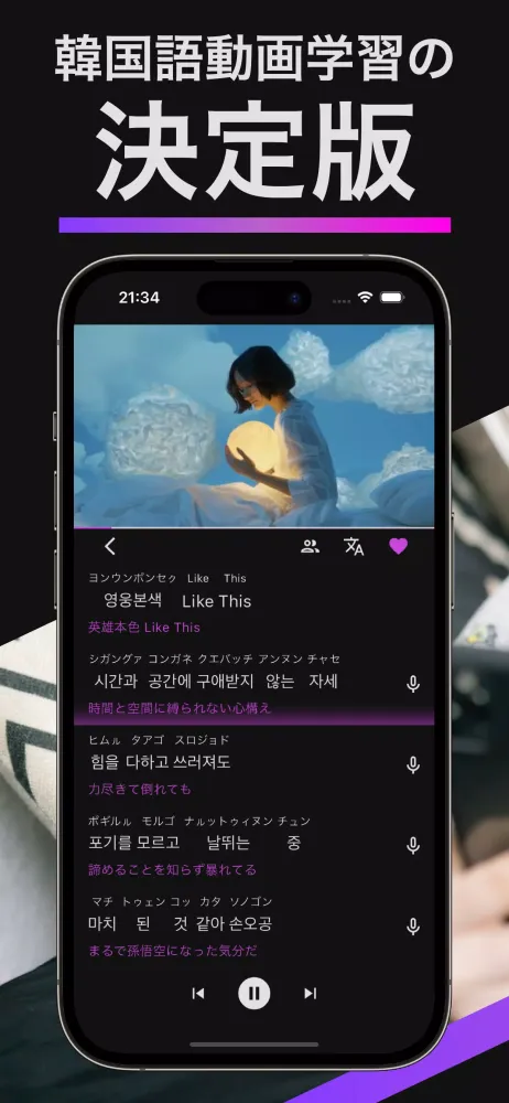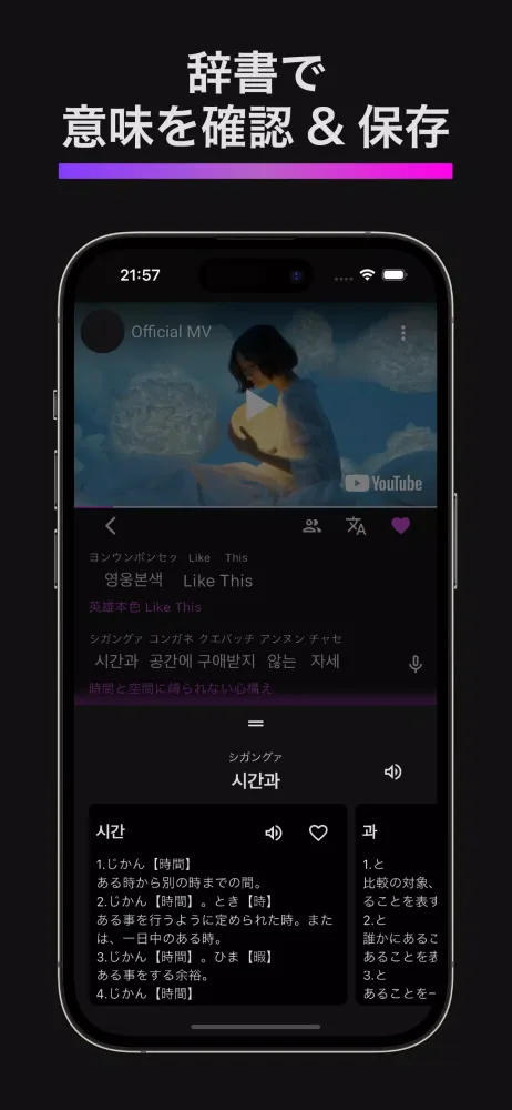 Master your vocabulary, Hangul, meaning, pronunciation, and grammar with recommended videos! With "韓国語をK-POPで勉強 - Manaoke (マナオケ)," your favorite K-POP content transforms into a dynamic educational tool. Whether you're a beginner or an advanced learner, this app provides an immersive Korean learning experience that is both engaging and effective.