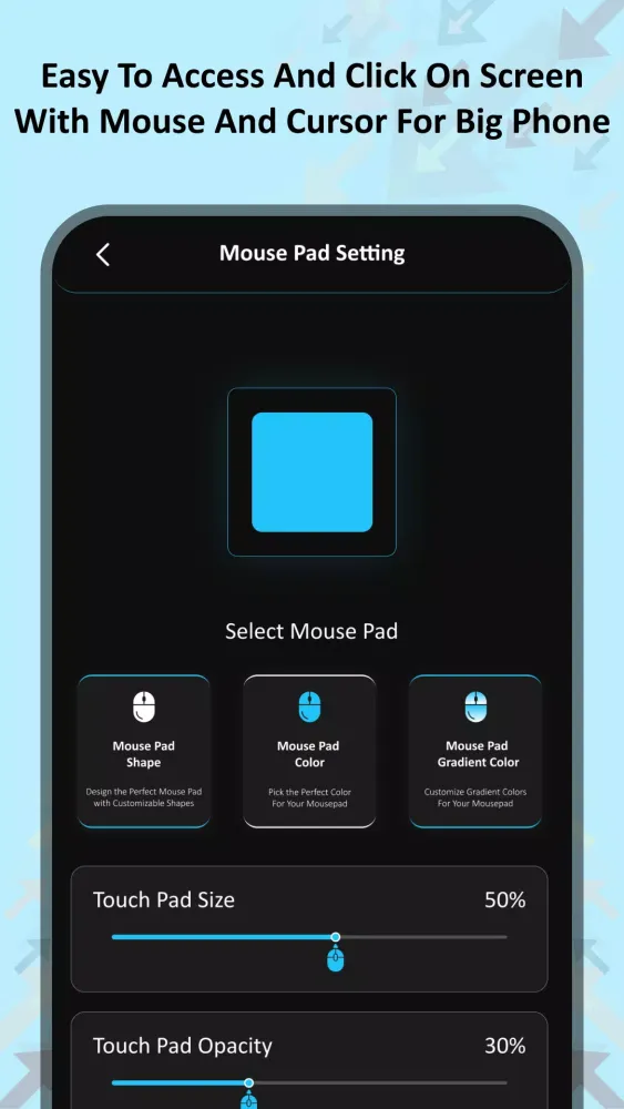 - Customizable Mouse Pad: Increase the touchpad size for your mouse with just one click. Customize the appearance of your mouse pad by selecting shapes, changing background colors, or even using photos from your gallery.
