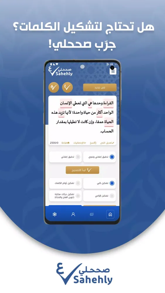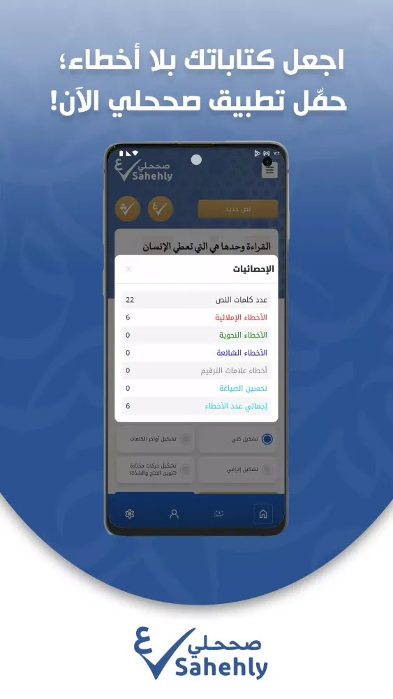 Sahehly is a powerful application designed to enhance your Arabic writing by providing precise corrections for grammar, spelling, and Tashkeel. Whether you are a student, a writer, or a professional, Sahehly is your go-to tool for ensuring your writing is flawless.