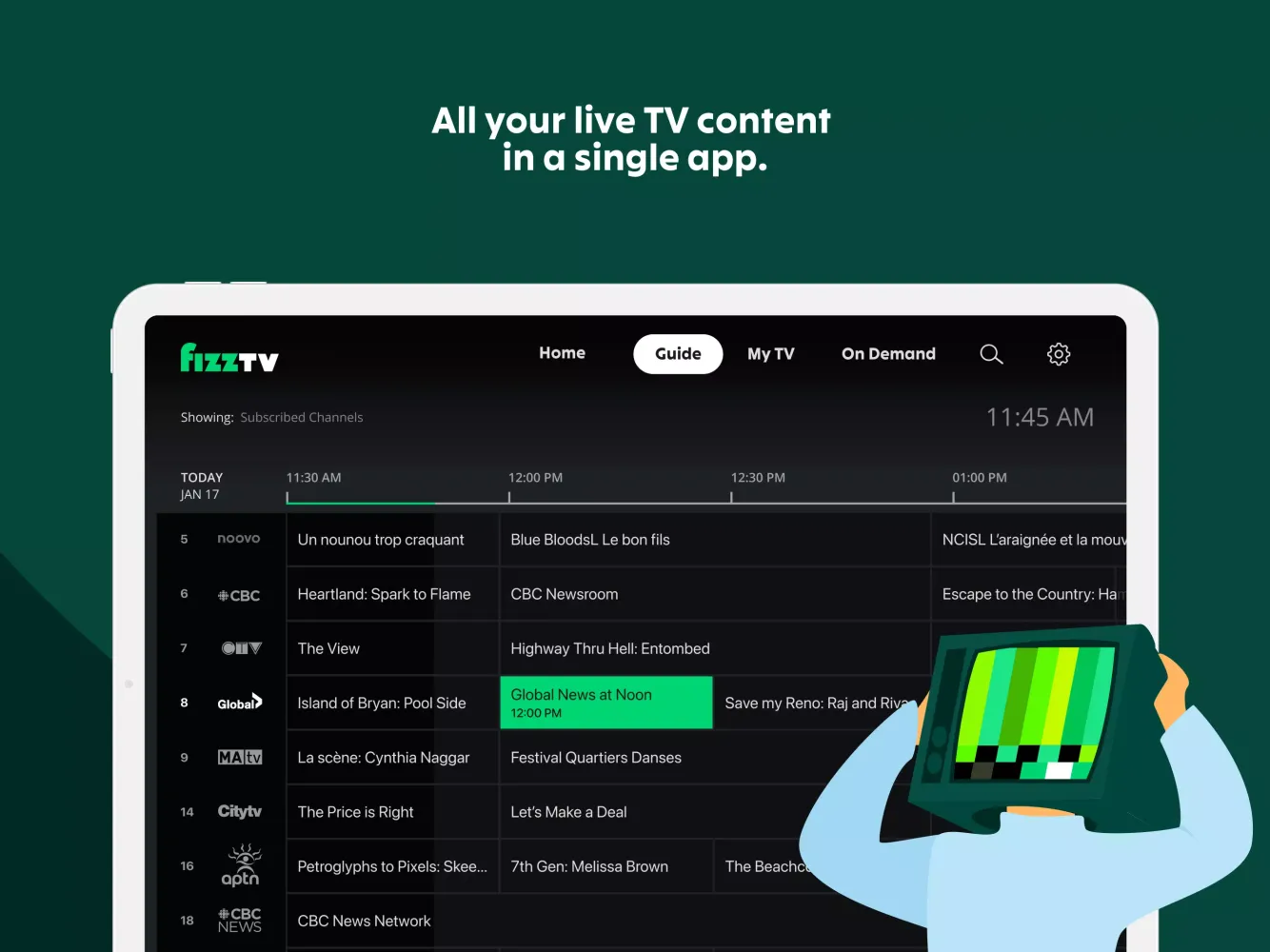 Fizz TV is redefining the way you consume media by offering an all-in-one streaming platform that combines live TV with on-demand content. Whether you're looking to catch up on your favorite shows or enjoy uninterrupted live broadcasts, Fizz TV has got you covered. With over 200 channels available, including popular networks like CBC, Global, CityTV, ABC, CBS, NBC, FOX, PBS, A&E, Bravo, Crave, CNN, HBO, Home Network, Flavor Network, Sportsnet, TSN, W, Slice, and many others, Fizz TV provides a comprehensive library of content tailored to suit every viewer's preferences.