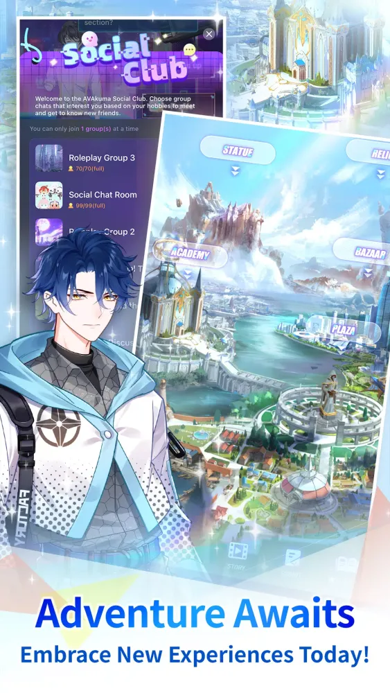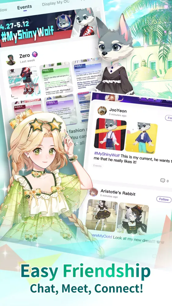 Dive into our in-app mini-game, exploring with like-minded friends and earning exclusive clothes for your characters. Explore different areas with your own characters, such as the Plaza, Bazaar, Academy, and more. Collect new outfits and add them to your collection.