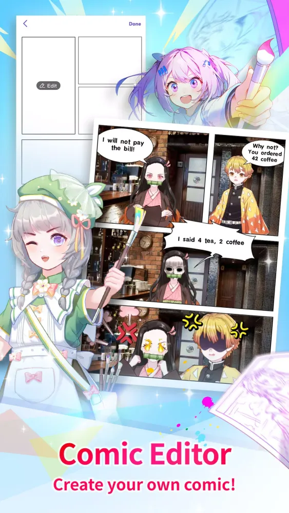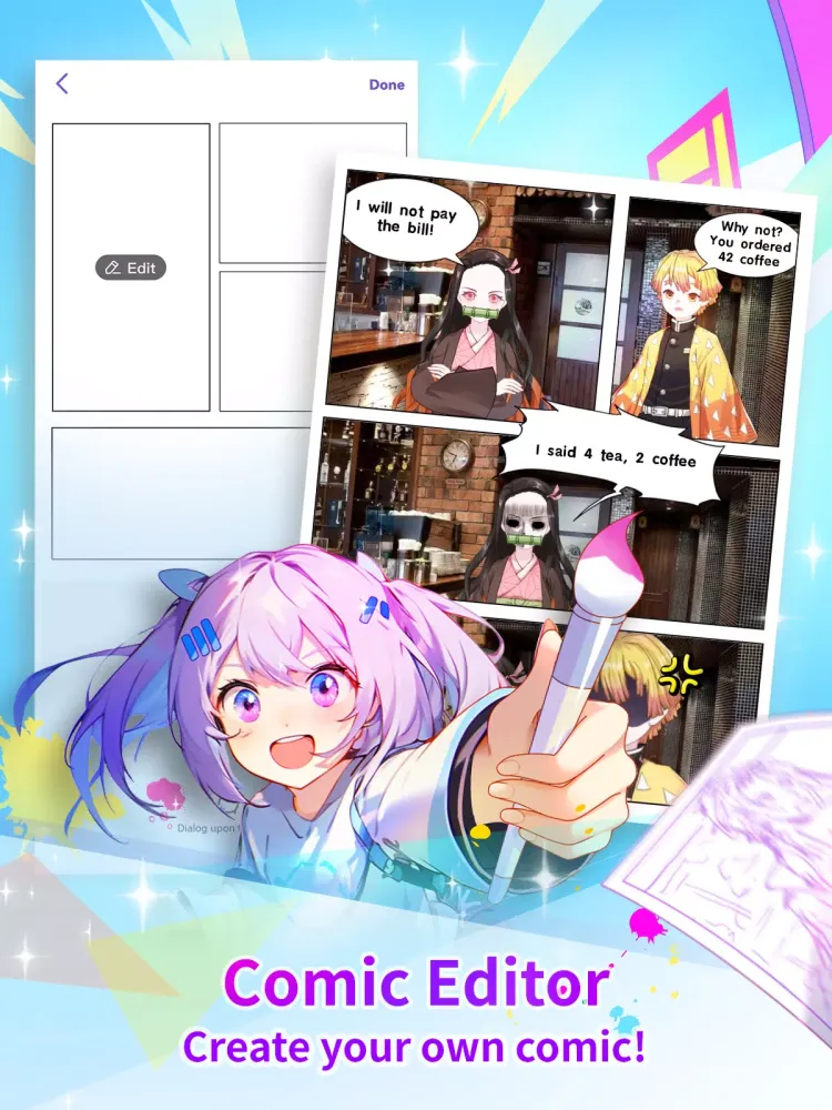 All the characters you create are at your disposal. Use them in your new Comic Editor to create magnificent stories with a plethora of tools and elements. Start creating Manga, Anime, Comic, or Webtoon today. You can even create fan art with our tool. The Comic/Anime Creator feature allows you to unleash your creativity and bring your characters to life in a whole new way.
