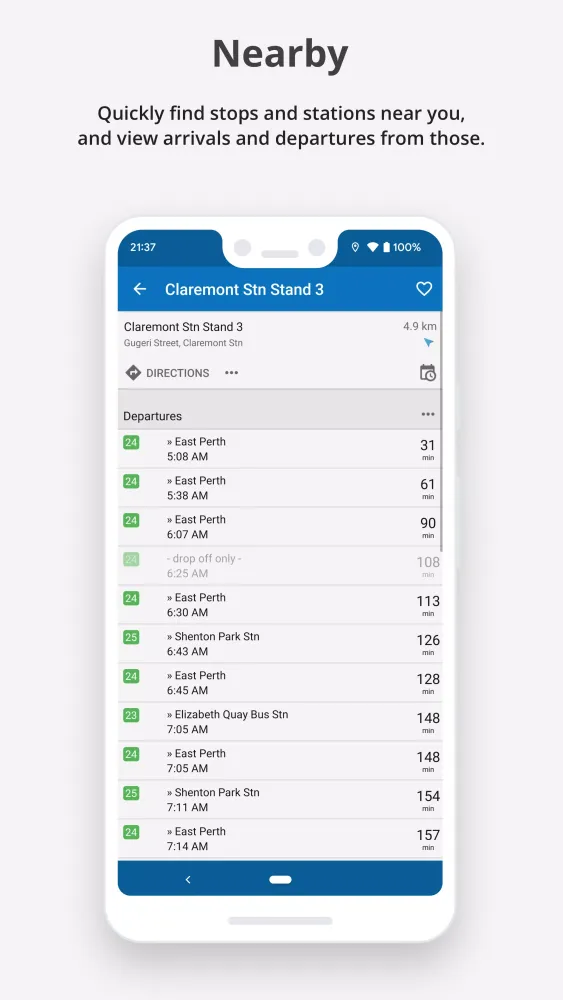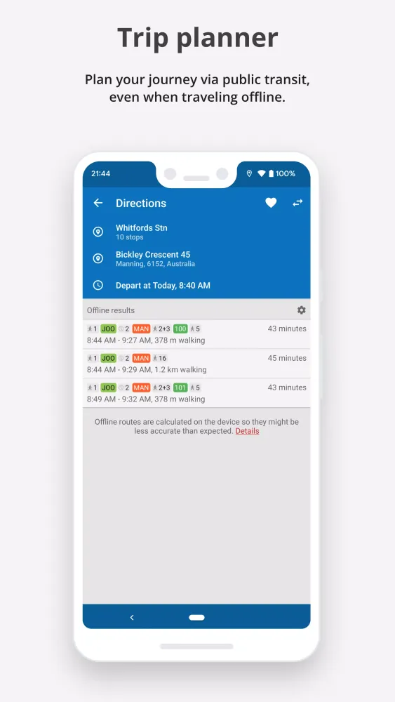 Perth Transit: Bus & Rail is a comprehensive public transport schedule and trip planner application designed specifically for residents and visitors in Perth, Western Australia. Whether you're navigating the bustling city streets or exploring the picturesque suburbs, this app ensures you stay informed about bus, train, and ferry schedules. What makes it stand out is its offline functionality—everything from browsing schedules to planning trips can be done without an active internet connection.