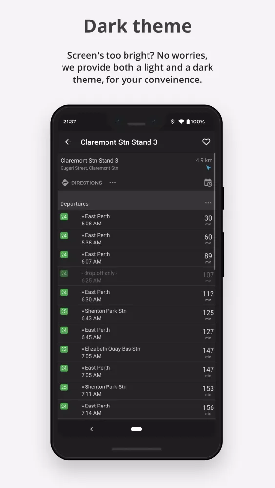 For added convenience, Perth Transit allows you to add frequently used routes directly to your home screen via the app widget. This means less scrolling and more efficiency! Additionally, users have control over the app’s visual theme—switch between light and dark modes either manually or set it to automatically adjust based on system settings. These thoughtful touches make the experience smoother and more enjoyable.