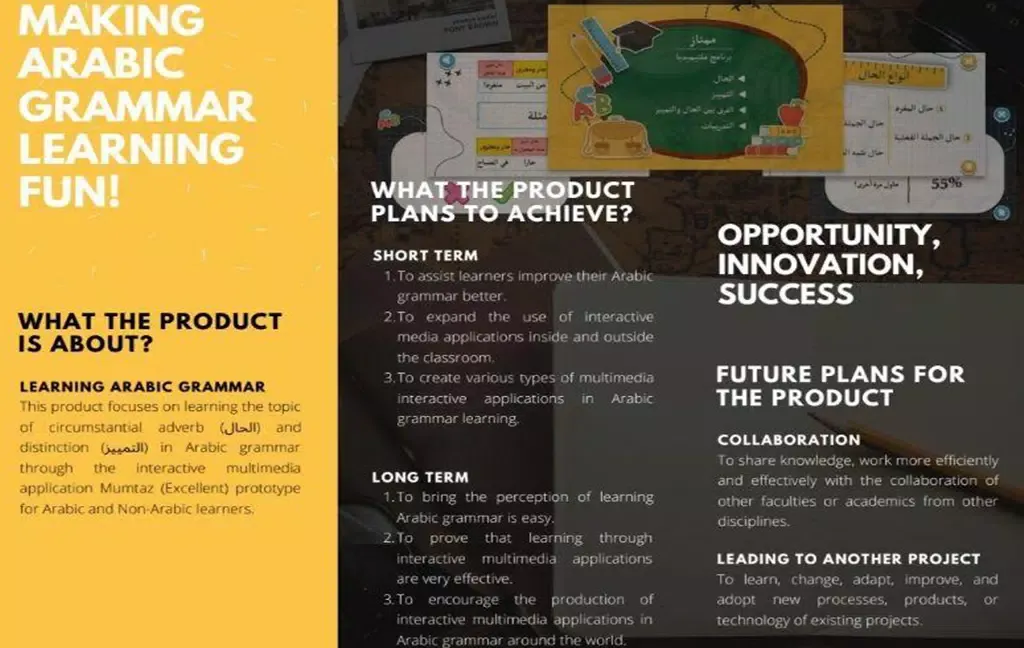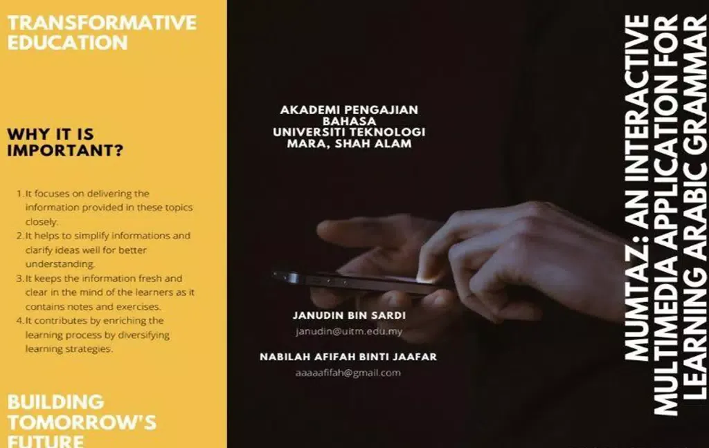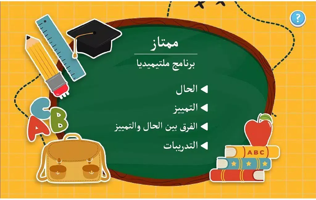 Mumtaz, meaning "excellent" in Arabic, is an innovative interactive multimedia application designed to facilitate the learning of Arabic grammar, specifically focusing on two complex topics: circumstantial adverb (الحال) and distinction (التمييز). The need for such an application arises from several pressing issues within Arabic education. Students often perceive Arabic as a challenging language due to its intricate grammar rules, which can discourage them from pursuing further studies in the subject. Additionally, traditional teaching methods employed by educators tend to be less engaging and less effective, while existing grammar applications remain scarce. These challenges highlight the necessity for a more dynamic and user-friendly approach to Arabic language education.