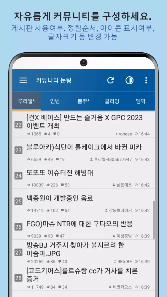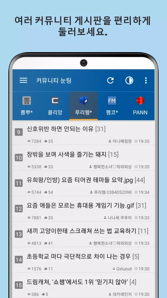 Community Eyeing, an innovative application designed to streamline your access to some of the most popular community bulletin boards in Korea, has made its debut. This app consolidates bulletin boards from leading Korean community websites, offering users a seamless way to browse and engage with content across multiple platforms. Whether you're looking for the latest news, entertaining content, or insightful discussions, Community Eyeing is your one-stop solution.