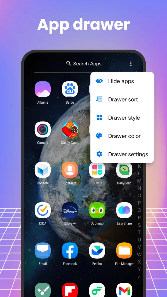 - Choose from a variety of app drawer styles: vertical, horizontal, or section style.