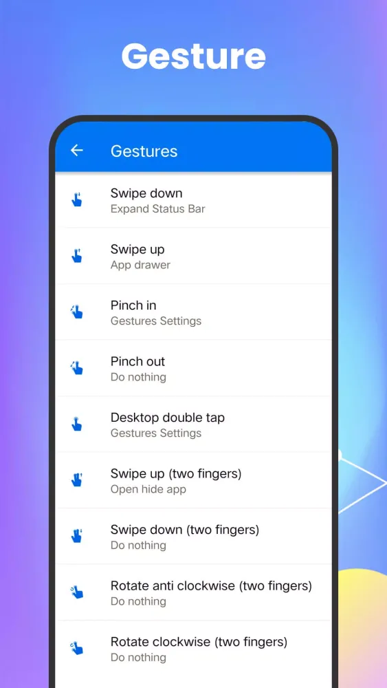 - Set gestures for desktop operations, such as Swipe Up for app drawer, Pinch In for screen editing, and Double Tap to open hidden apps.