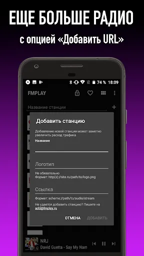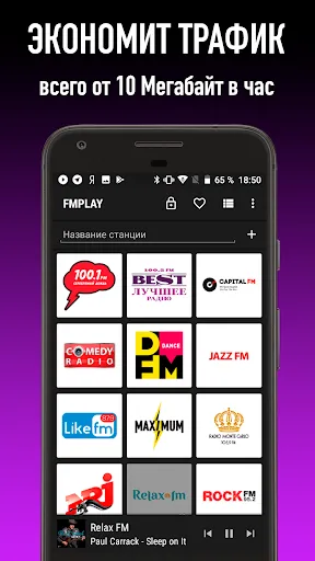 FMPLAY позволяет слушать онлайн радио в медленных сетях 2G/EDGE и существенно экономить мобильный трафик, ведь один час прослушивания любой радиостанции "съедает" от 7 до 20 Мегабайт данных (в зависимости от установленного битрейта). Приложение будет продолжать работать, даже если закончился трафик на Вашем тарифе.