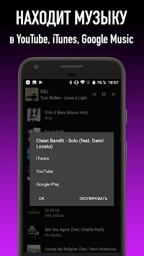• История треков. На большинстве музыкальных радиостанций отображаются названия треков и история из 10 последних песен. Долгое нажатие на нужный трек открывает меню с возможностью найти трек на YouTube, Google Play, iTunes или скопировать его в буфер.