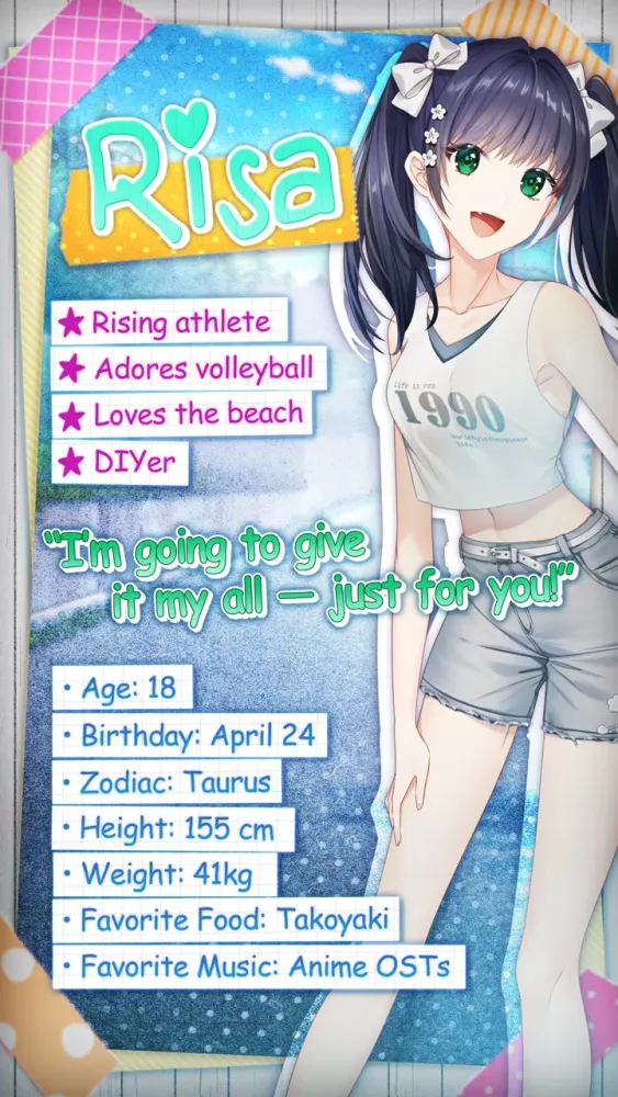 Risa is a lively and cheerful girl who loves sports and dreams of making it big. Her radiant smile often draws admirers, but she remains blissfully unaware of their attention. She looks up to your attitude and determination. Will you be able to keep pace with her energetic spirit and ambitions?