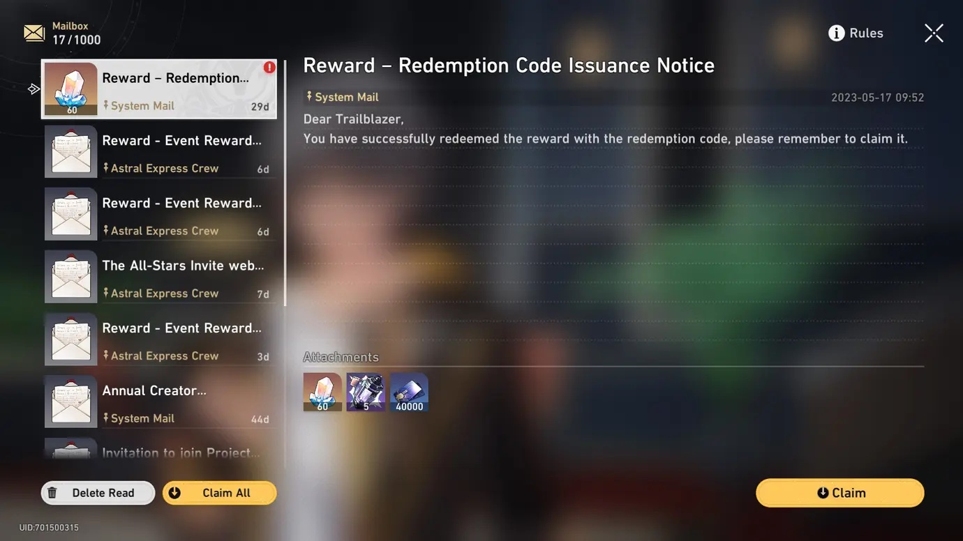 • HSRINGAMESTOP - 10,000 Credits, x4 Adventure Log, x2 Lost Gold Fragment, x3 Sweet Dreams Holographic Ticket