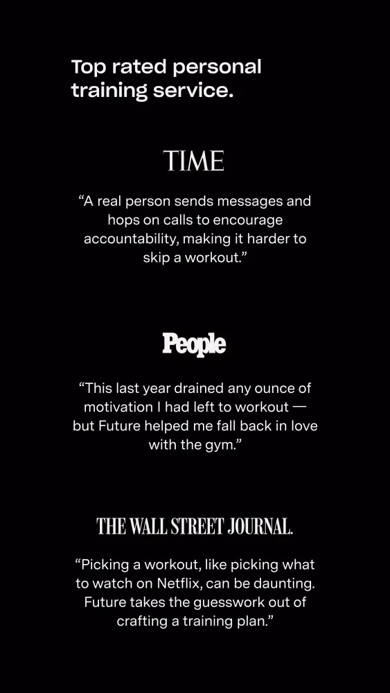 Secara singkat, Future bukan hanya aplikasi kebugaran lainnya — ia membawa cara revolusioner untuk berinteraksi dengan pelatihan pribadi. Dengan memanfaatkan teknologi terkini bersama keahlian manusia, Future memberikan personalisasi, fleksibilitas, dan hasil yang didorong oleh keberhasilan. Jadi, apakah Anda bertujuan mencapai kondisi fisik terbaik atau hanya ingin menjalani gaya hidup yang lebih sehat, Future siap memandu Anda setiap langkahnya.