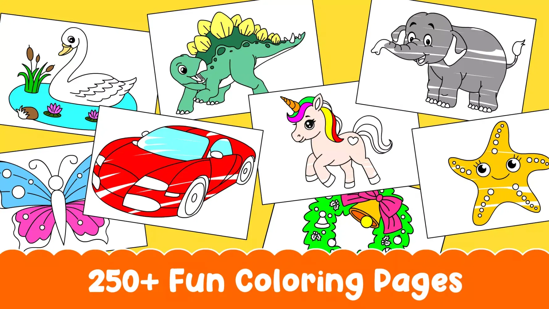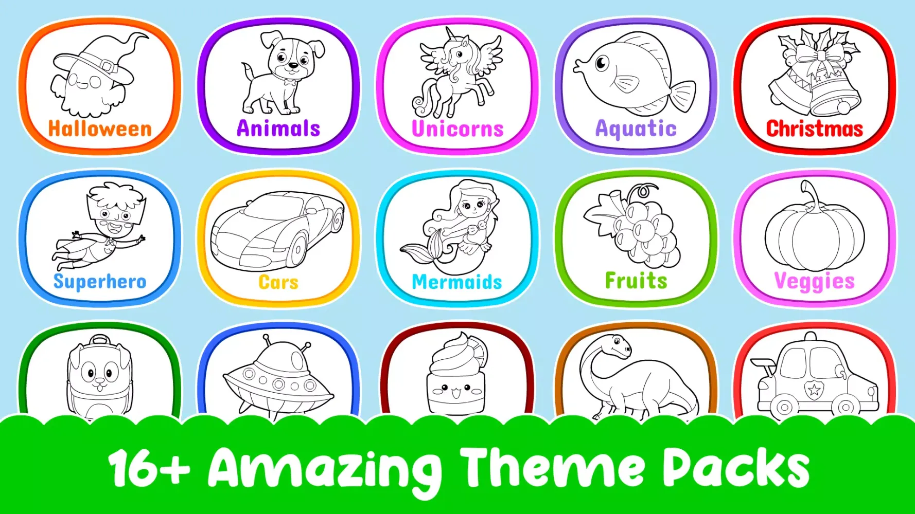 - 250+ Exciting Coloring Pages: Explore 16+ diverse themes including Animals, Cars, Unicorns, Christmas, Halloween, and more!
