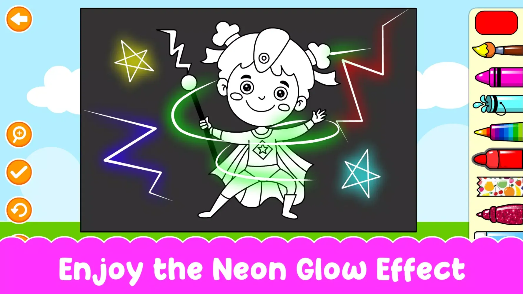 - Neon Glow Pens and Glitter Tools: Add a magical touch to every drawing with neon glow pens and sparkling glitter tools.