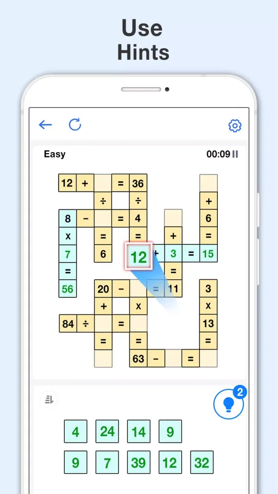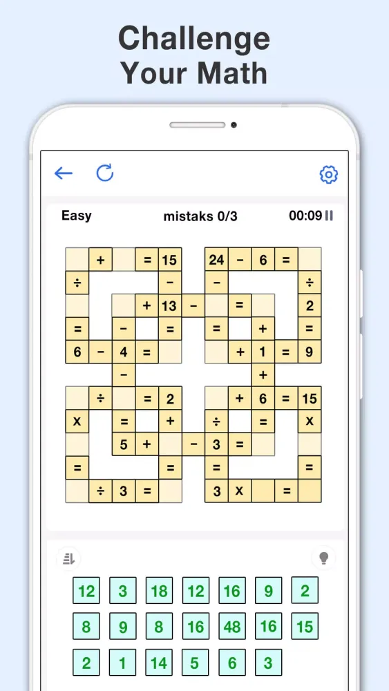 Playing Math Cross is simple yet challenging. Your goal is to fill all empty cells with candidate numbers to make the equations true. Here’s how: