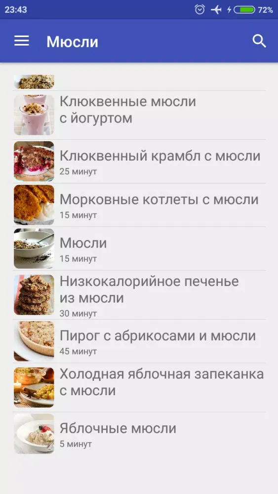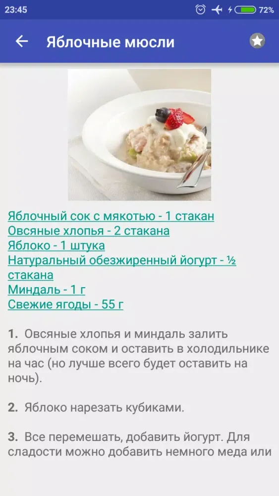 The application offers a detailed guide on how to prepare various dishes using muesli. Each recipe includes the name of the dish (often with its national origin), estimated preparation time with images, a list of required ingredients with quantities and proportions, equipment and conditions needed for preparation, servings, calorie content (and sometimes protein, fat, and carbohydrate content), step-by-step instructions, and serving methods.