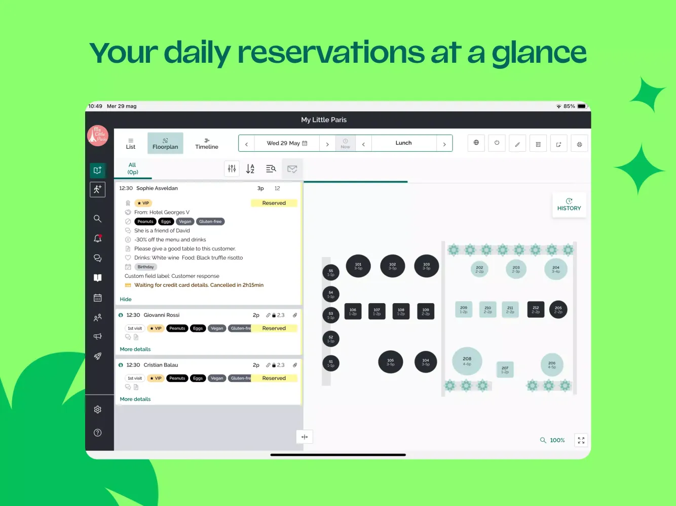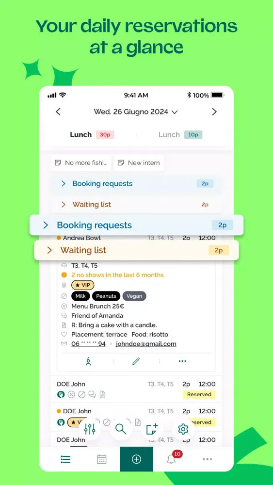 With TheFork Manager, you get a clear overview of your reservation diary. This allows you to navigate through all essential information related to your bookings and clients effortlessly. You can access their specific requests, prepare for their arrival, and offer them a personalized experience that enhances guest satisfaction.