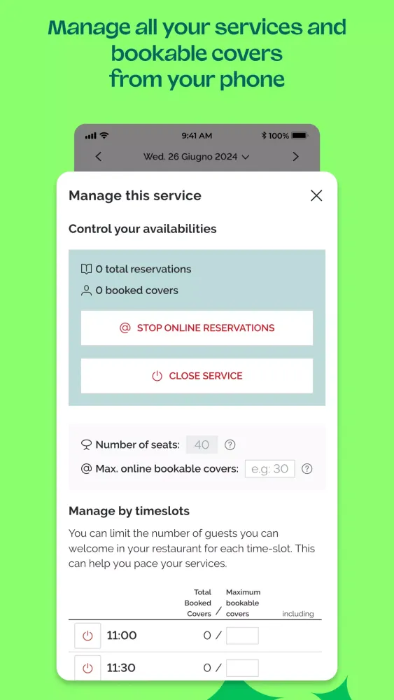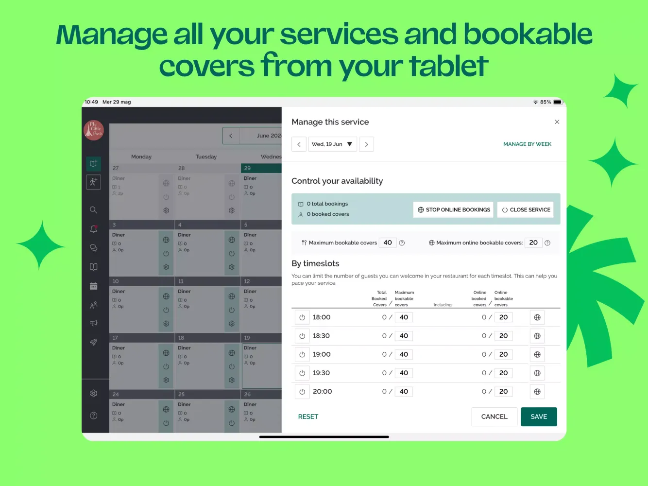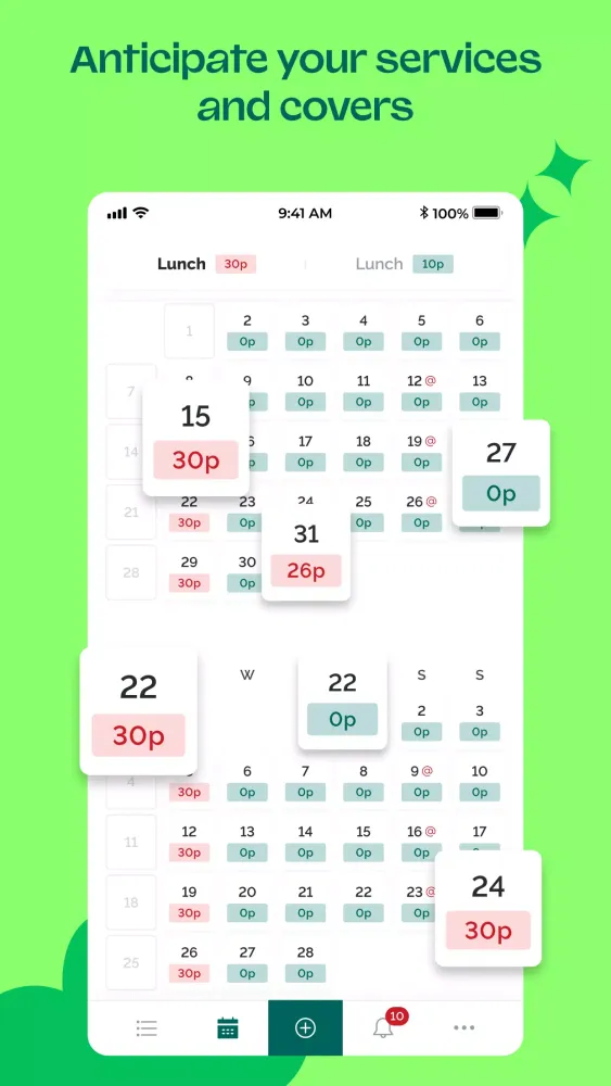 Effortlessly manage your services and covers with an intuitive interface. Get quick access to the management of your availability by service. You can open, close, or edit the number of bookable covers directly from your device. The calendar view gives you a visual snapshot of all your bookings for up to four weeks, making it easier to plan ahead and anticipate future demand.