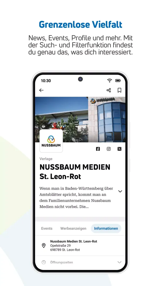 NUSSBAUM also stands out for its incredible diversity of content. Our app caters to a wide range of interests, offering everything from detailed event listings to engaging profiles of local personalities. If you're searching for something specific—be it a music festival, a local business spotlight, or even a hidden gem in your area—the app's powerful search and filter functions make it easy to find exactly what you're looking for. Whether you're a culture enthusiast, a foodie, or simply someone who enjoys discovering new things, there's something here for everyone.
