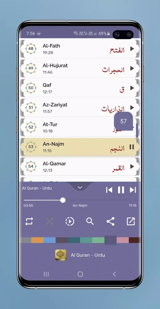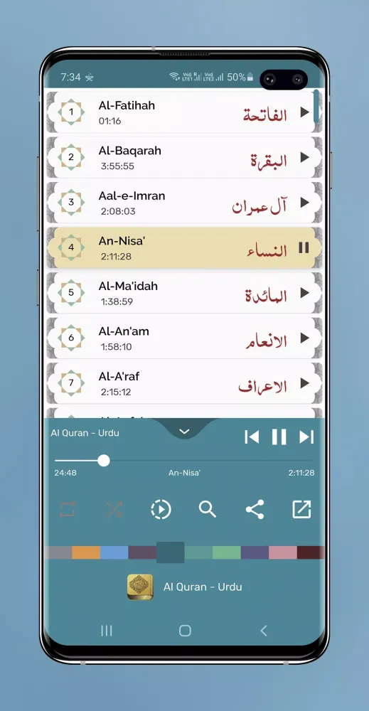 Each surah is presented with its respective audio file, allowing users to listen to the recitation while reading the text. This combination of audio and text enhances the user's engagement with the Quran, fostering a more profound connection with its message. The app also includes additional features such as the ability to bookmark favorite verses, create playlists, and share selected passages with others. These tools make it easier for users to personalize their Quranic journey and share their insights with family and friends.