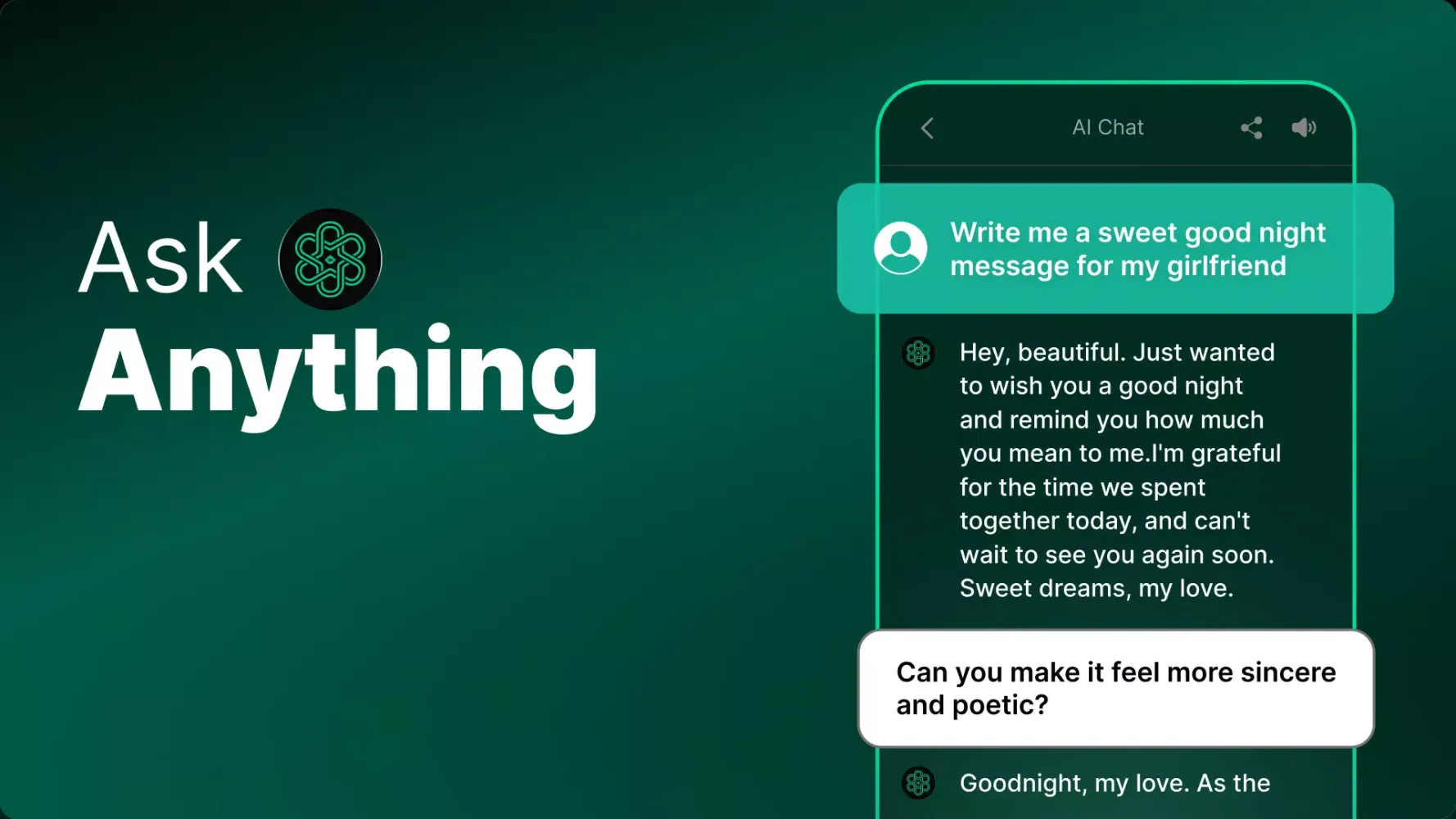 Use AI Chat for all types of writing projects, from essays and compositions to social media posts and poems. The app can also help you craft unique pickup lines or create original songs, making it a versatile and creative tool.