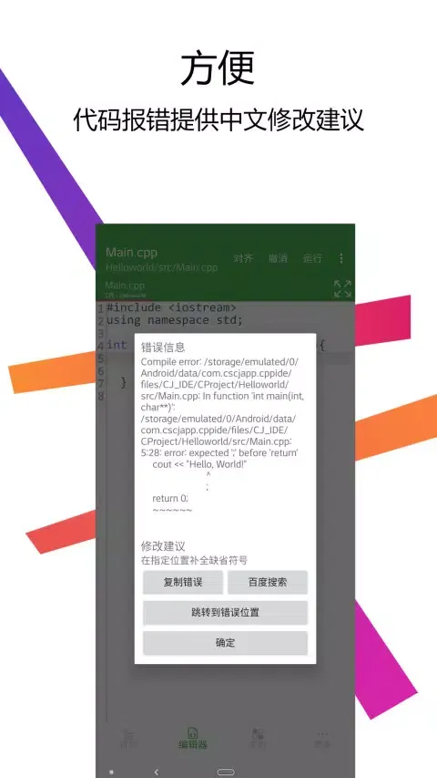 Chinese Error Feedback: When errors occur during compilation, we provide clear, Chinese error messages along with direct navigation to the problematic line, facilitating a deeper understanding of the issue at hand.