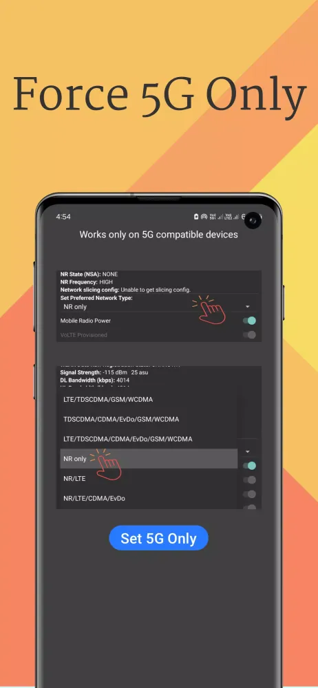 - User-Friendly Interface: The app features a simple and intuitive design, making it easy for users of all tech levels to switch between network modes. With just a few taps, you can set your phone to 5G-only mode and start enjoying enhanced speeds.