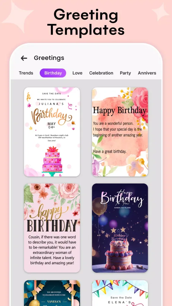 If static images aren’t enough, Cake Frame takes things to the next level with its intuitive Video Maker tool. Turn your cherished memories into cinematic videos complete with smooth transitions, background music, and artistic filters. The app simplifies the process of creating a birthday video by offering pre-designed templates and allowing users to seamlessly blend photos and videos. With support for multiple tracks of music and advanced editing options, you can tell your story in a way that feels authentic and meaningful. Sharing these videos directly on social media platforms is effortless, ensuring your loved ones feel connected no matter where they are.