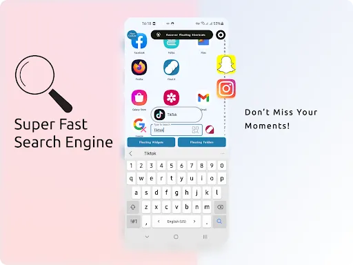 Usually all of us have many applications. So, to find one of them in a long list is frustrating. Search Engine is a very helpful tool. By this feature you can save lots of times! You want to share a photo of your enjoyable moments in social medias. It's enough to search their name to create Floating Shortcuts in one second.