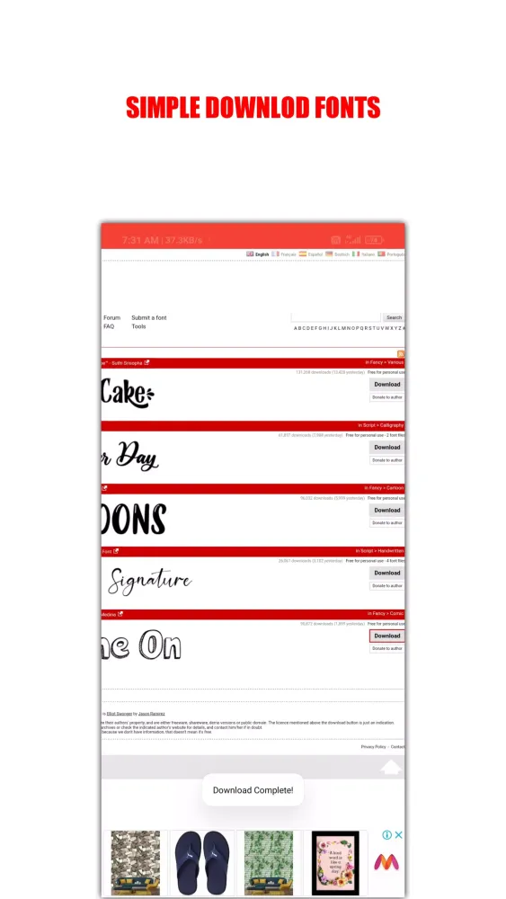 Looking for a simple, fast, and reliable way to access an extensive collection of fonts? Look no further! DaFonts Lite is here to revolutionize your font downloading experience. This application is specifically designed for Android users who want to enhance their design projects with a vast variety of fonts. With over 10,000,000+ fonts available, DaFonts Lite ensures that you'll never run out of creative options.